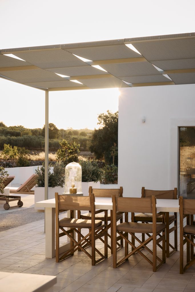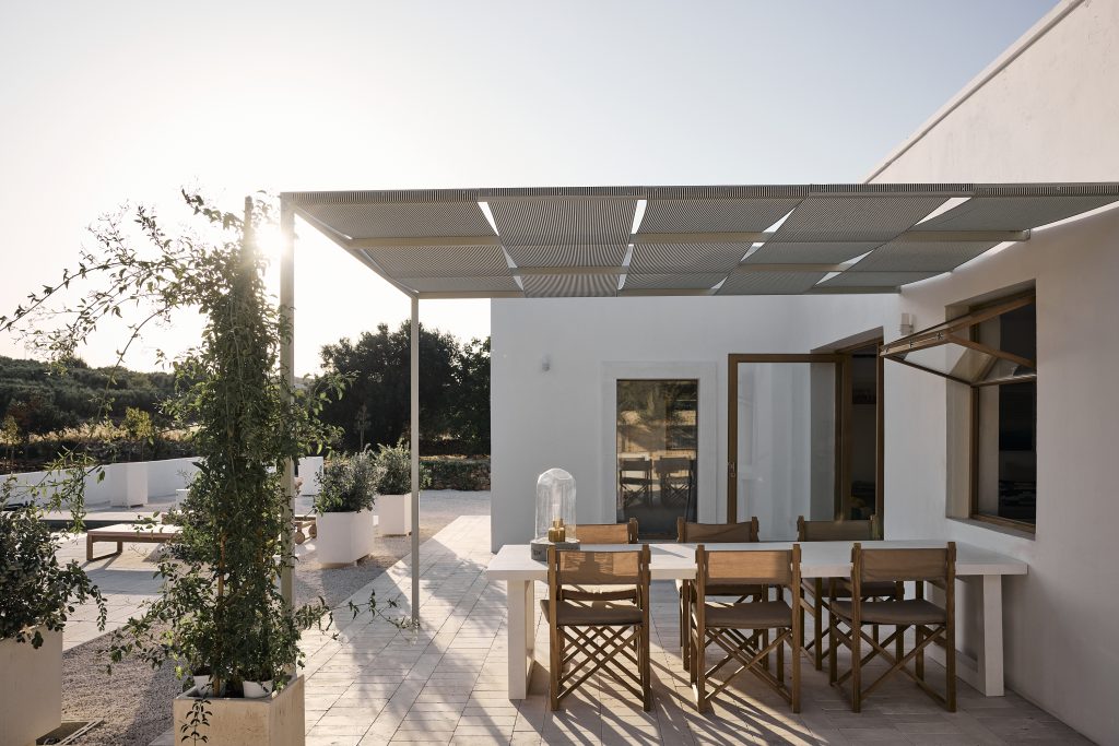 From the beginning, the kitchen was envisioned as the centerpiece of the house a space that would anchor the layout and invite connection. Designed in collaboration with Fronteriors, the kitchen features a striking marble backsplash and a long dining table that stretches toward the garden. The custom designed pass-through window, connecting the kitchen to the outdoor pergola, is a standout feature that enhances flow, invites natural light, and creates a seamless, poetic dialogue between interior and exterior, perfectly attuned to the relaxed rhythm of life in Puglia.